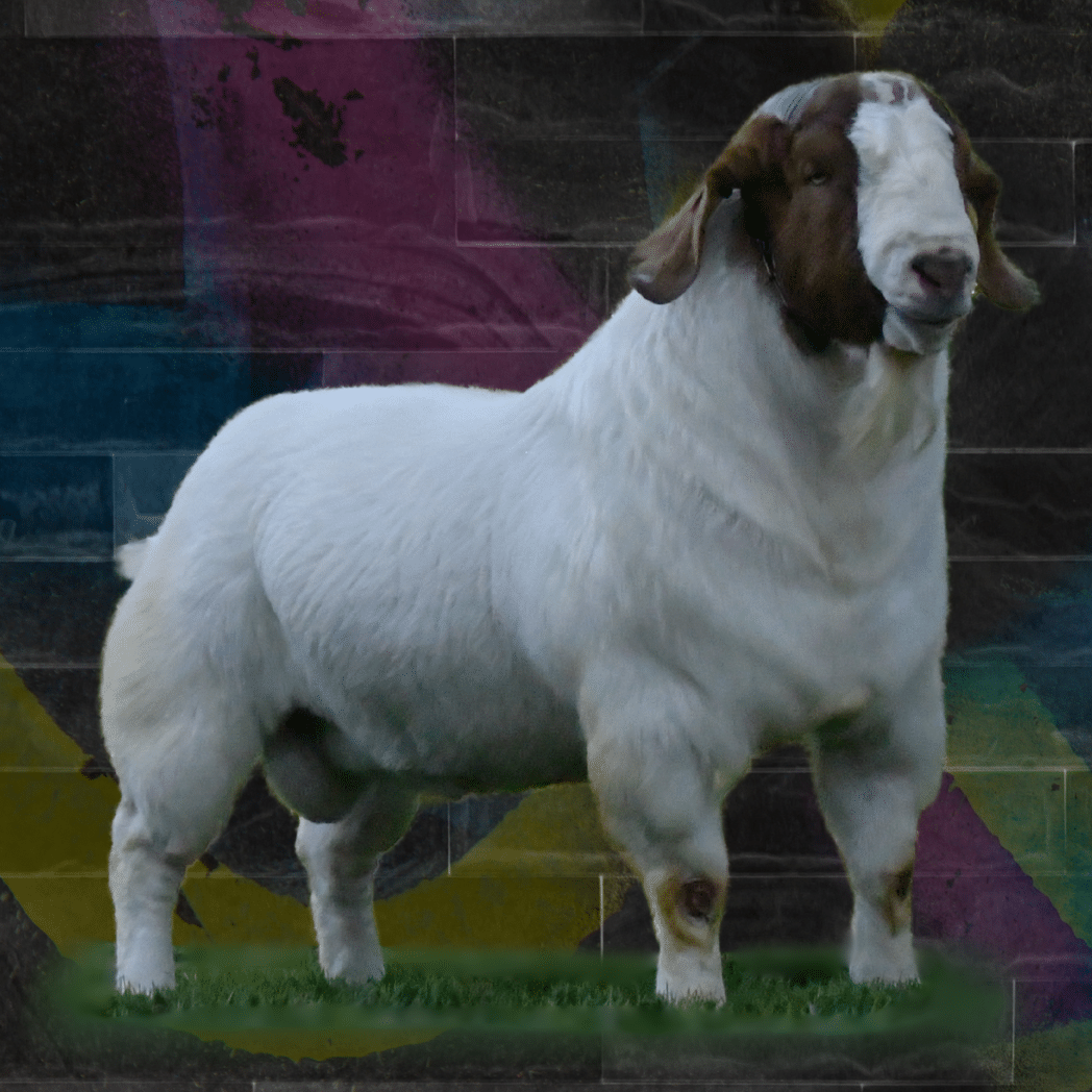 PIG has earned his keep at Dot Farm and it’s time to share his genetics with a larger audience. He is registered with the ABGA at 50% and is turning out high quality market/commercial and percentage kids. He has been bred to wether or ABGA breeding-type does resulting in heavy muscled, good footed, attractive offspring. He produced the ABGA Grand Champion Percentage Doe at the 2025 West Virginia State Fair, the Reserve Grand Champion Percentage Doe at the 2025 Indiana State Fair, Grand Champion Percentage Doe at the 2025 Indiana Youth Expo, and the Grand Champion Percentage Doe at the 2026 Fort Worth American Premier ABGA Show, in addition to many grand champion or top 5 wethers and does in 2024 and 2025 4-H and jackpot shows. He also sired several champions and high point animals in the Indiana Boer Goat Association show series in 2025. In his own show career as a junior and yearling-aged buck, he was named Grand or Reserve Grand Commercial buck at every show he entered in Indiana and Ohio. He is not currently show correct, but can produce ABGA show correct kids if that’s what you’re looking to make.