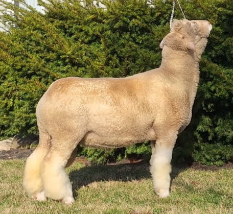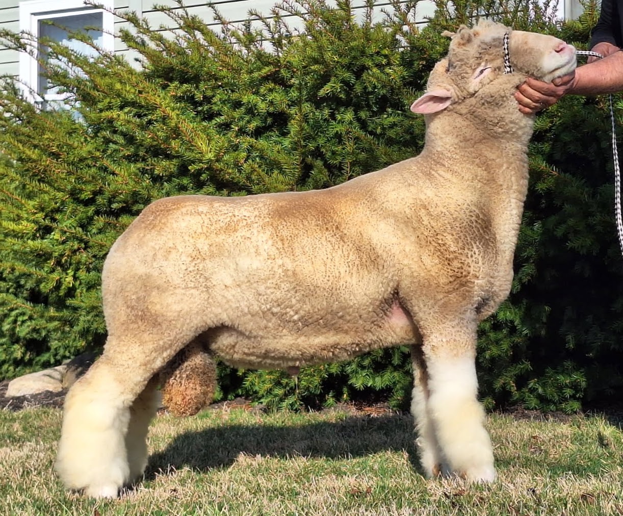 Whether you’re evaluating him for a show ring or looking to improve a commercial flock, this ram is a powerhouse of functional anatomy. He isn’t just “big”—he’s built with the kind of structural integrity that translates to longevity and high-quality offspring. One of his most striking features is the sheer volume of his hip. He carries an immense amount of muscle through his rump and twist, showing off a wide, level dock that carries down into a thick, bulging leg. This isn’t just “show” muscle; it’s the engine room that drives his movement. He possesses a remarkable depth of body. His rib cage is bold and sprung wide from the spine, providing ample “room to bloom.” From the top down, his rack is wide and firm, transitioning into a thick loin. The muscle is expressive and well-defined, indicating a high carcass yield and a genetic predisposition for fast-growing, heavy-muscled lambs. A ram of this size is only as good as his feet and legs, and this individual excels in motion. When viewed from behind, he “tracks wide,” meaning his hind legs follow the path of his front legs with perfect alignment. He doesn’t toe-in or hock-out; he plants each hoof firmly and squarely. His stride is fluid and effortless. Despite his heavy muscling, he remains athletic, hitting his tracks with a long, reaching step that suggests he can cover a lot of ground during breeding season without breaking down.